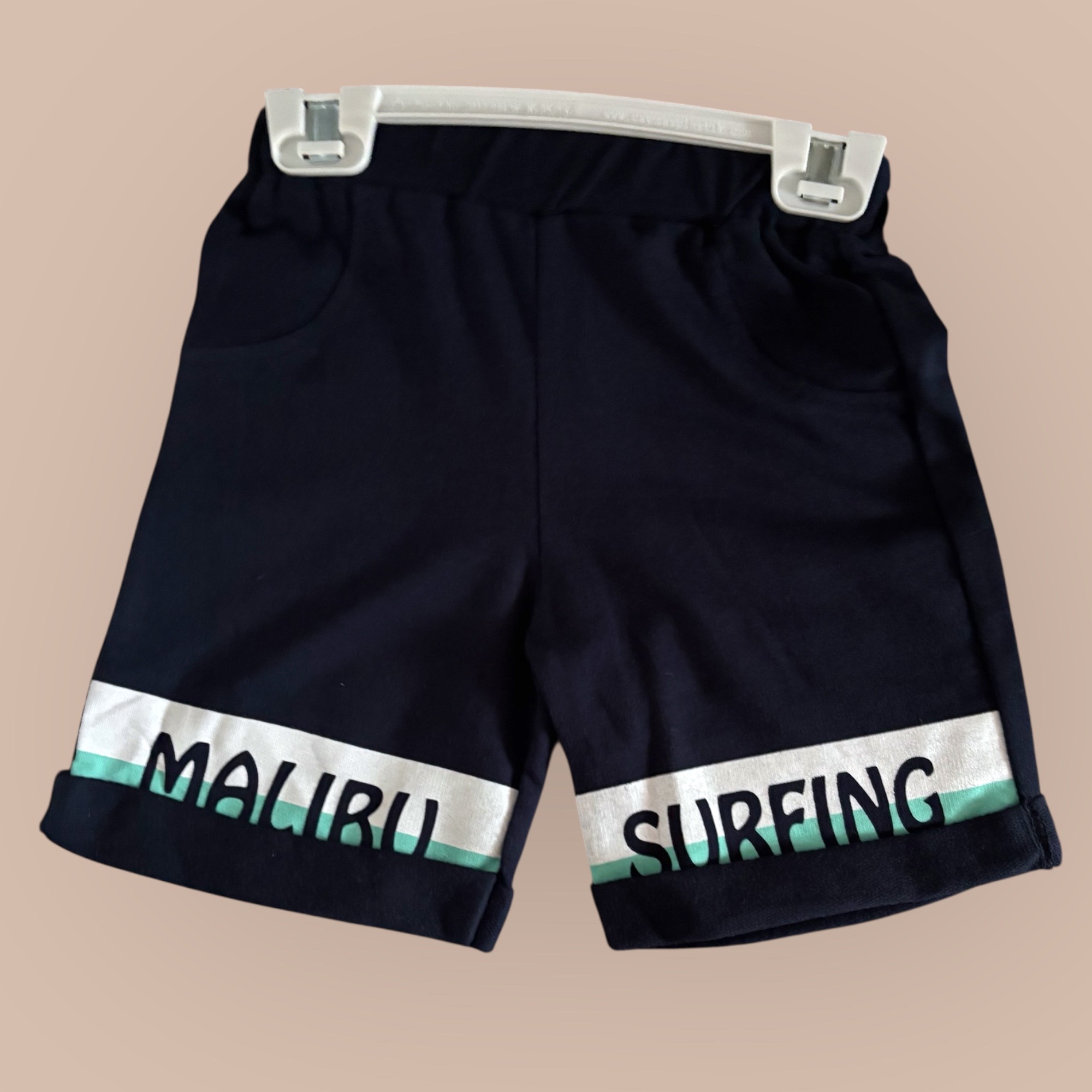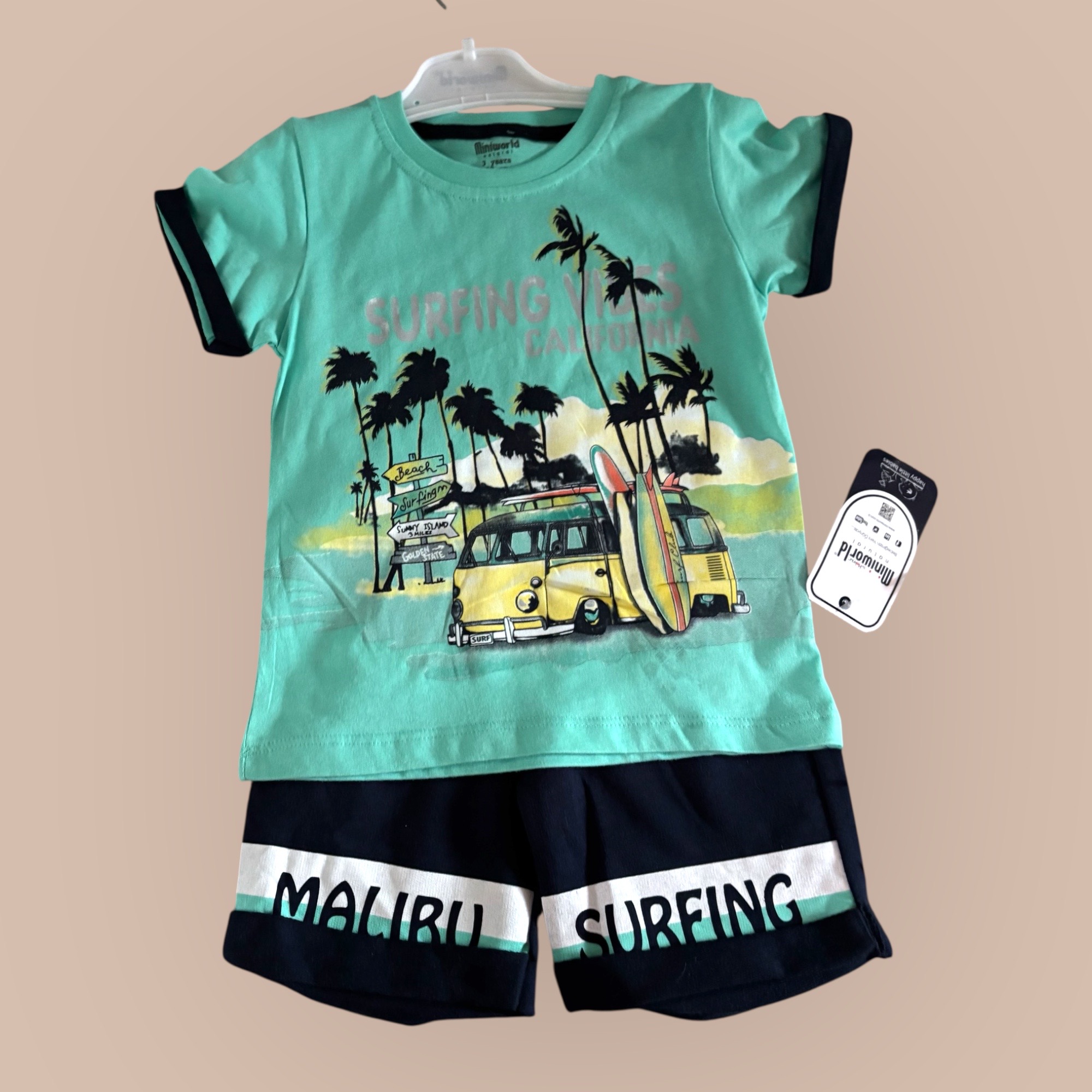 Ett set med en T-shirt och ett par shorts i lätt sweatshirtkvalitet med tryckta motiv. T-shirten har rund, ribbad halsringning, nedhasad axel och ribbad mudd i nederkant. Shortsen har klädd resår och dragsko i midjan.