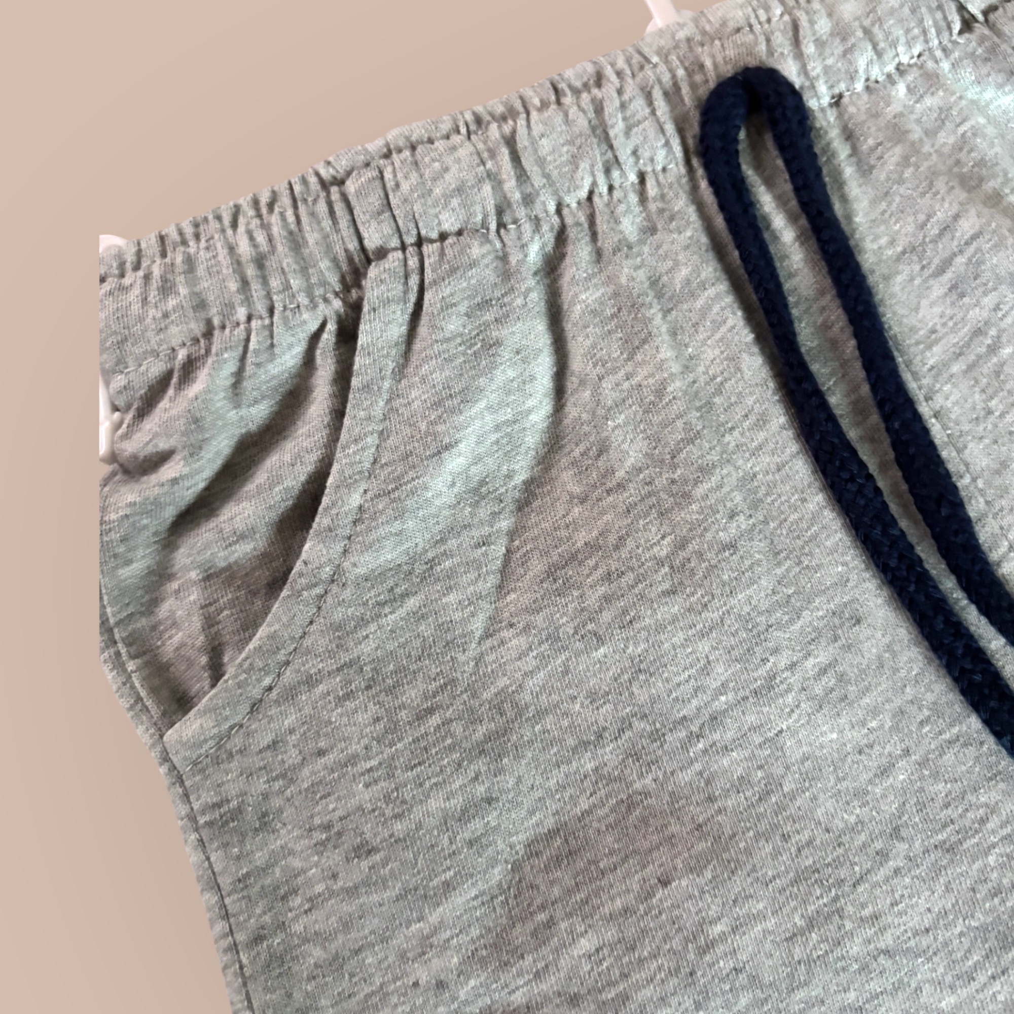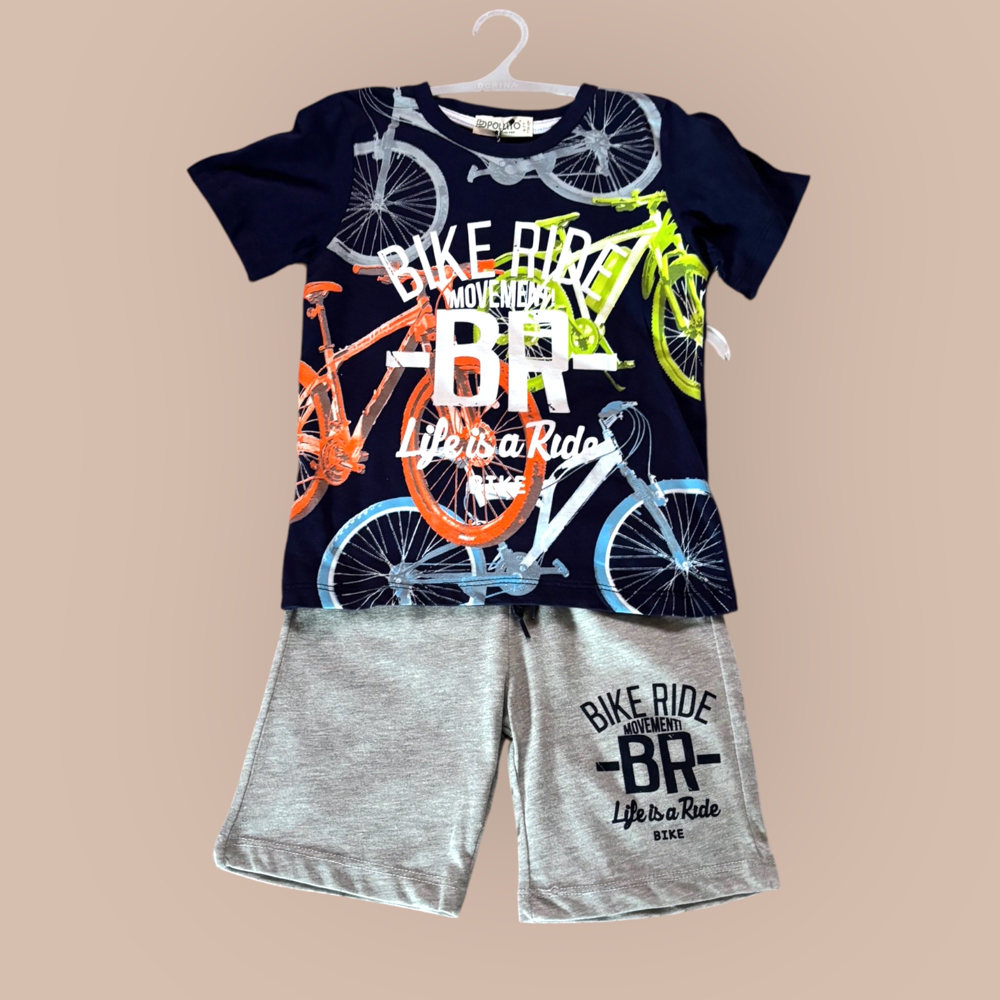 Ett set med en T-shirt och ett par shorts i lätt sweatshirtkvalitet med tryckta motiv. T-shirten har rund, ribbad halsringning, nedhasad axel och ribbad mudd i nederkant. Shortsen har klädd resår och dragsko i midjan.