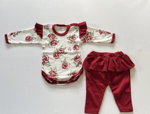 Detta bekväma set inkluderar en långärmad body med tryck av rosor och volanger .Mjuka leggings gjord i ekologisk bomull. Leggingsen har volang och bekväm infälld resår i midjan.