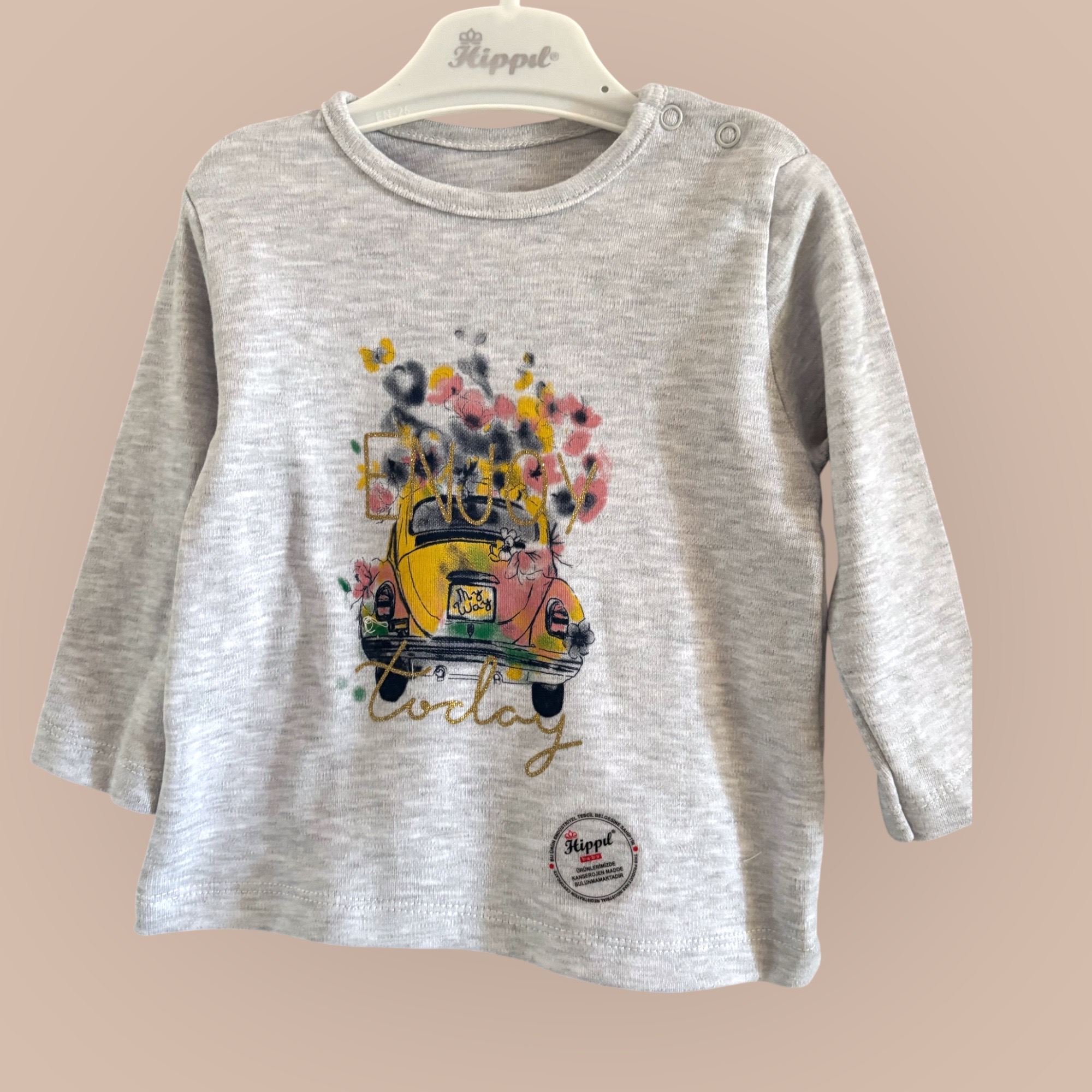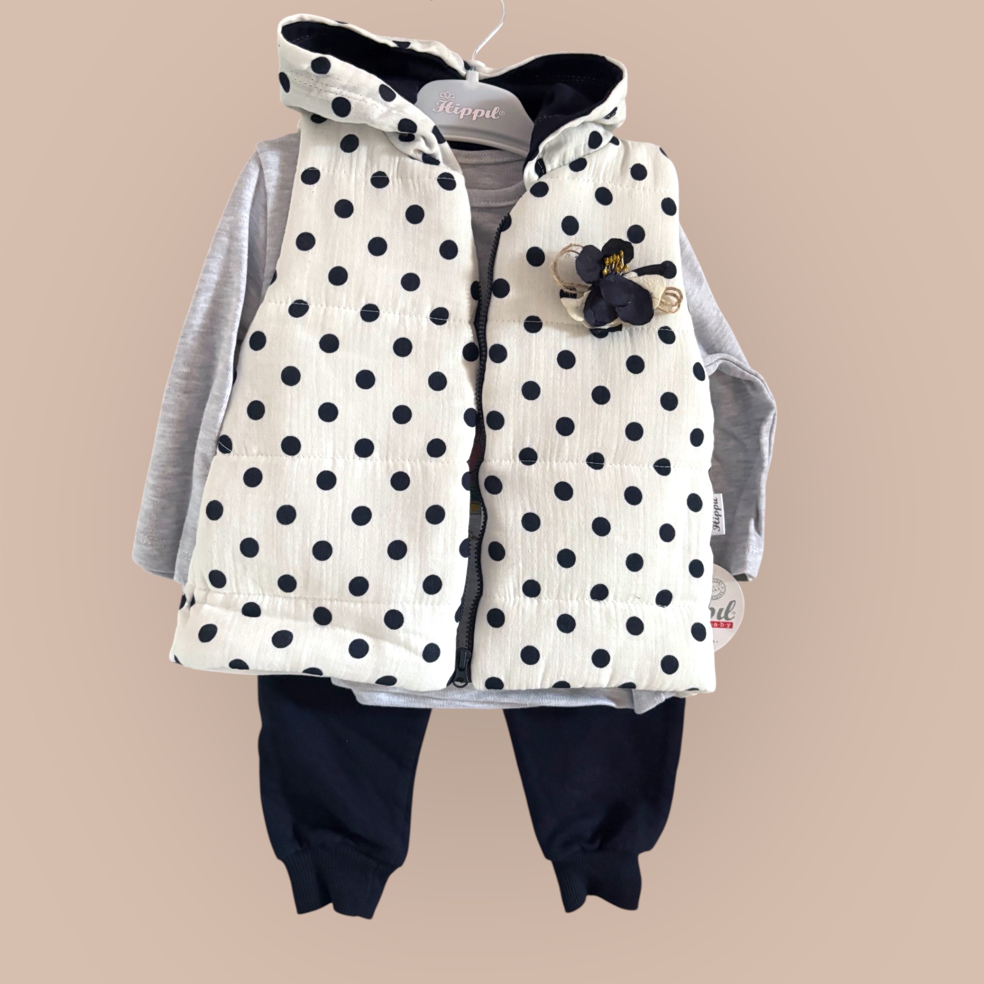 Detta bekväma set inkluderar en långärmad topp , byxor och väst. Toppen har en rund halsringning och ett roligt tryck. Byxorna har en elastisk dragsko i midjan för en bekväm passform.