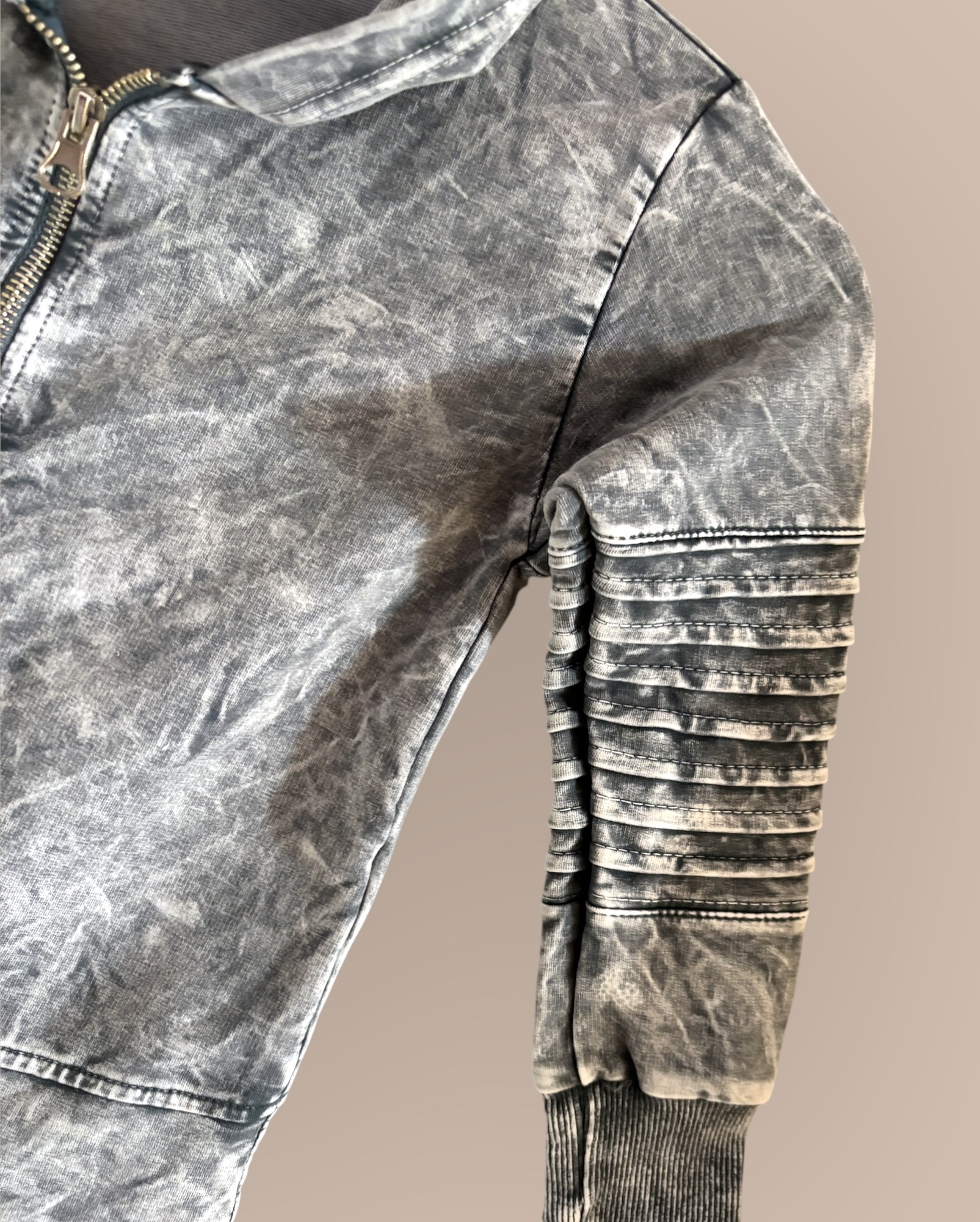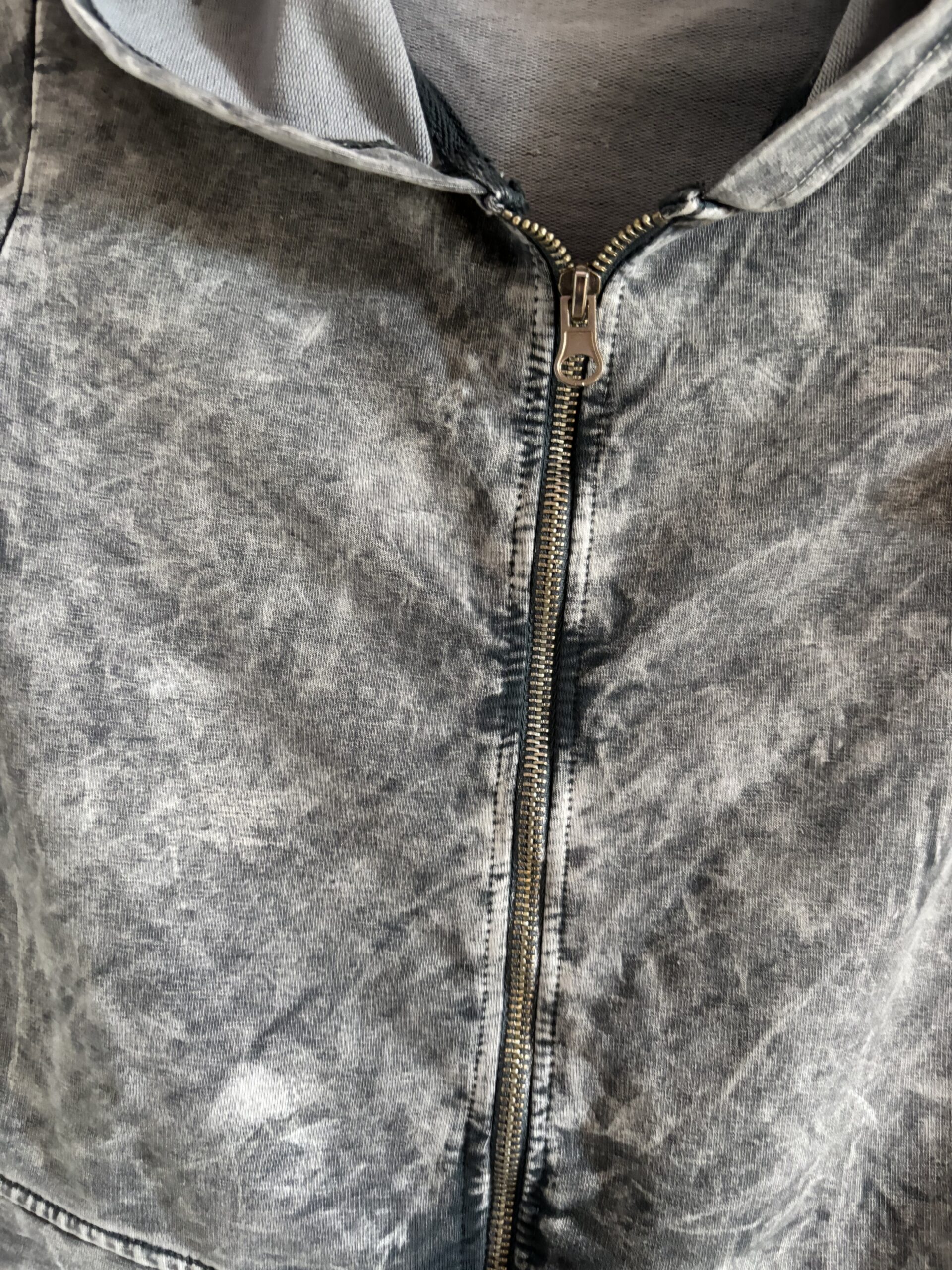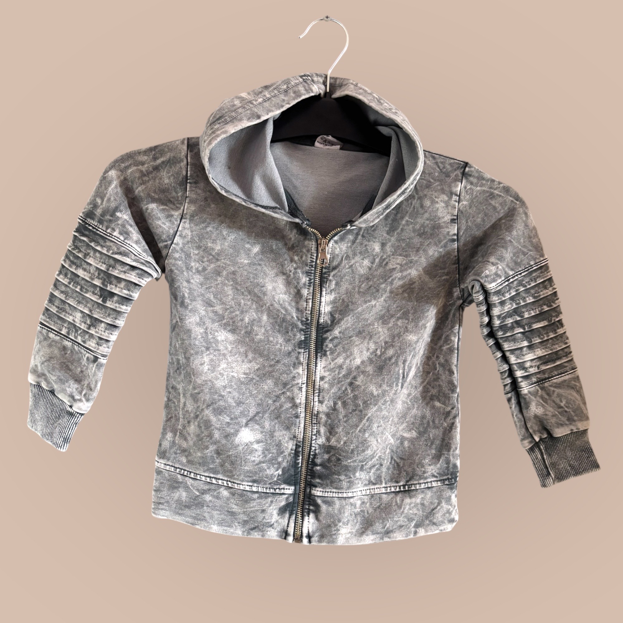 Den har dragkedja fram, nedhasad axel och kängurufickor. Ärmslut och nederkant i ribbad trikå.