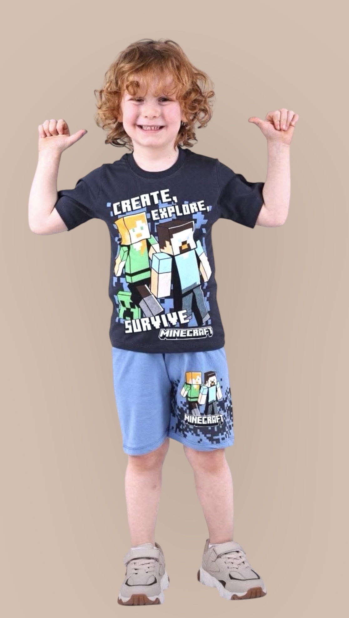 Minecraft-set : Överraska en liten Minecraft- barnset! Varje Minecraft-set består av en fashionabel Minecraft-t-shirt och korta byxor med en bekväm, elastisk linning.